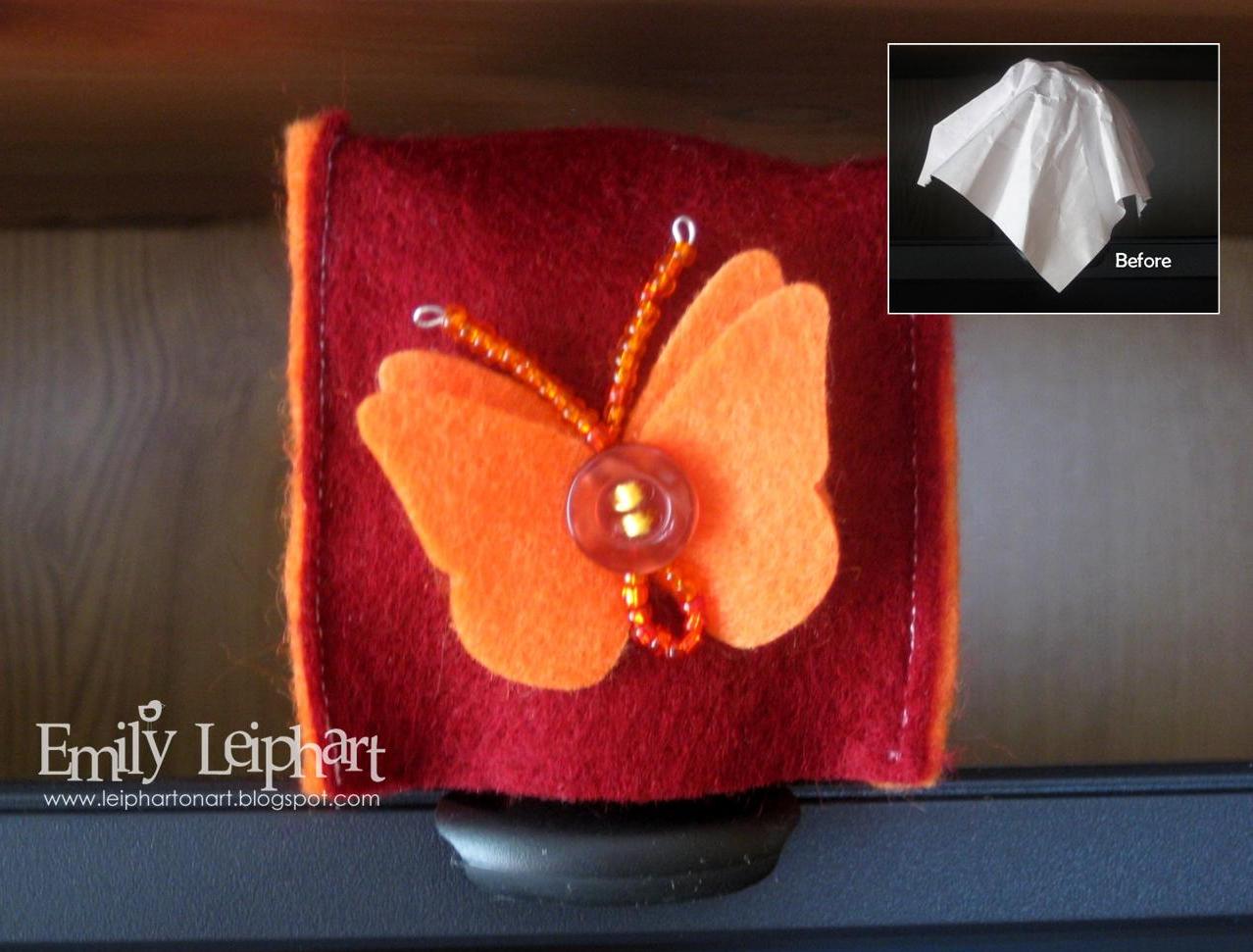 How funny is it that my son noticed the cover and my husband didn't? This was even after I told my husband that I made one! :Þ My son loves butterflies because we have a framed blue butterfly from my 2002 trip to Costa Rica and because one of his favourite books is The Very Hungry Caterpillar. Of course the little guy wanted to play with it. Sorry kiddo, a 21 month old can't play with buttons, beads and wire! I do have to agree with my husband that the piece of scrap paper was much more noticeable than this lovely little cover. LOL