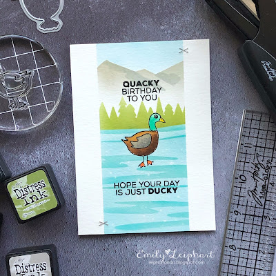 I stencilled the entire background using Trinity Stamps' Layered Lakeside Mountain stencil. To finish, I splattered shimmer mist on the water and used a tiny attacher to put two 'kisses' on the card. I think this bit of hardware makes it more of a masculine card.