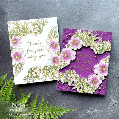 Next, I coloured the flowers and leaves using a mix of Copic markers and Sketchmarker Brush Pro markers, both of which are alcohol-based markers. Since my Sketchmarkers were gifted by Ellen Hutson and that store has closed down, I prefer to recommend the OLO markers available at Spellbinders and listed in the supply links below.