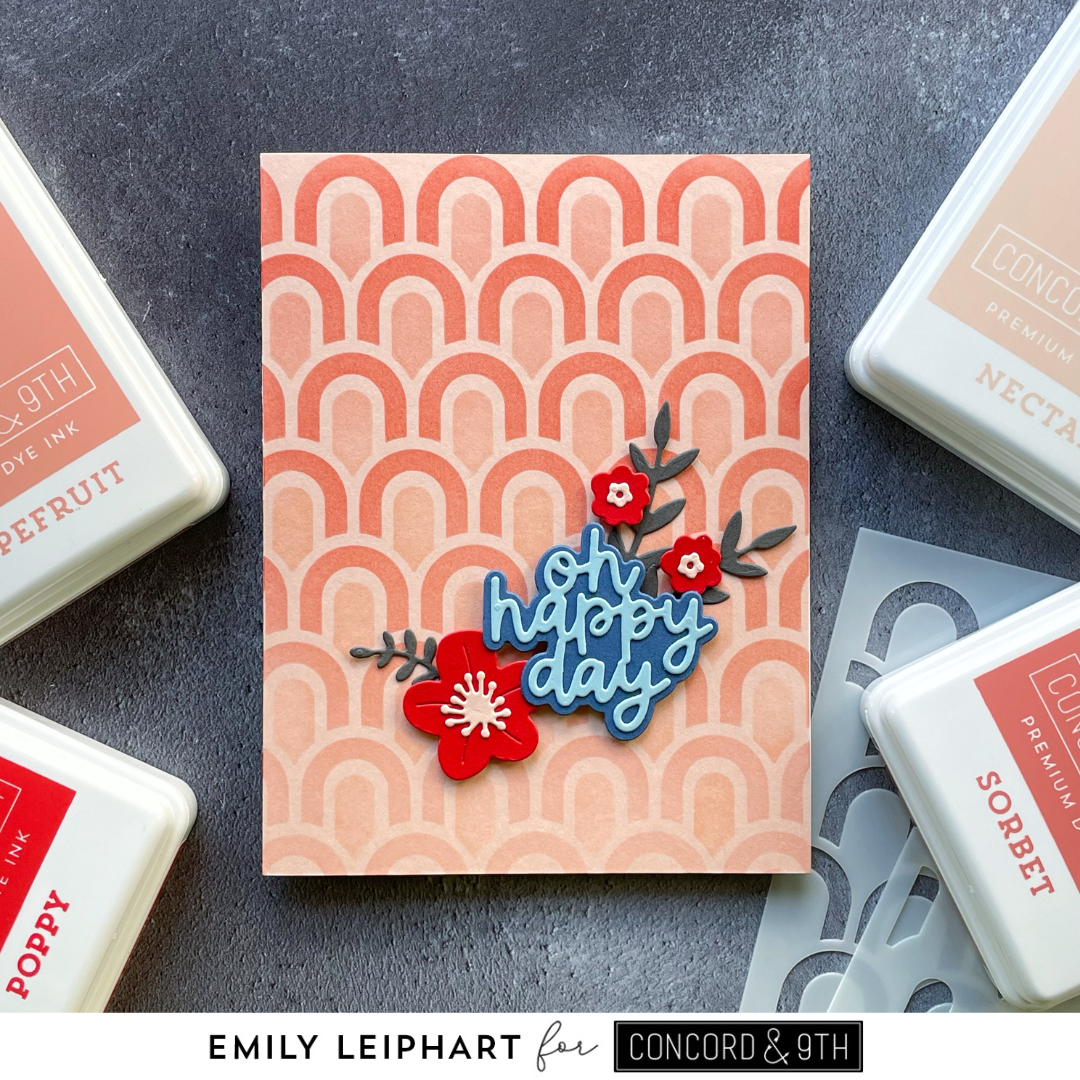 I started with a Nectar cardstock panel and placed it on a grip mat. I placed the arches stencil on top and started ink blending from the top down using Poppy, Sorbet, Grapefruit and Nectar inks, creating an ombre gradient as I moved down the panel. For the inside of the arches, I used Sorbet, Grapefruit and Nectar and a lighter hand.